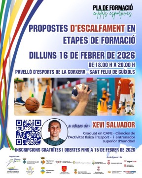 Ens plau informar-vos de les dues últimes sessions del Pla de Formació d'Entitats Esportives 25-26 , un programa dissenyat per enfortir les competències del personal tècnic, entrenadors/es i famílies vinculades a l'esport base del nostre territori. SESSIÓ 5: Propostes d'escalfament en etapes de formació Data i hora: Dilluns 16 de febrer de 2026, de 18.00 h a 20.00 h Lloc: Pavelló d'Esports de la Corxera -...